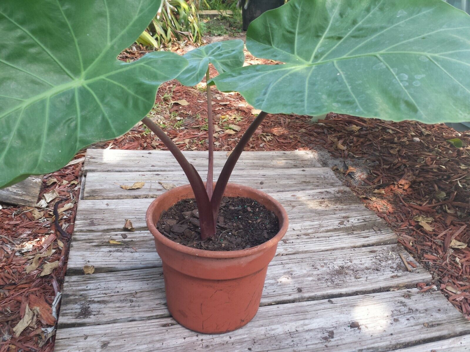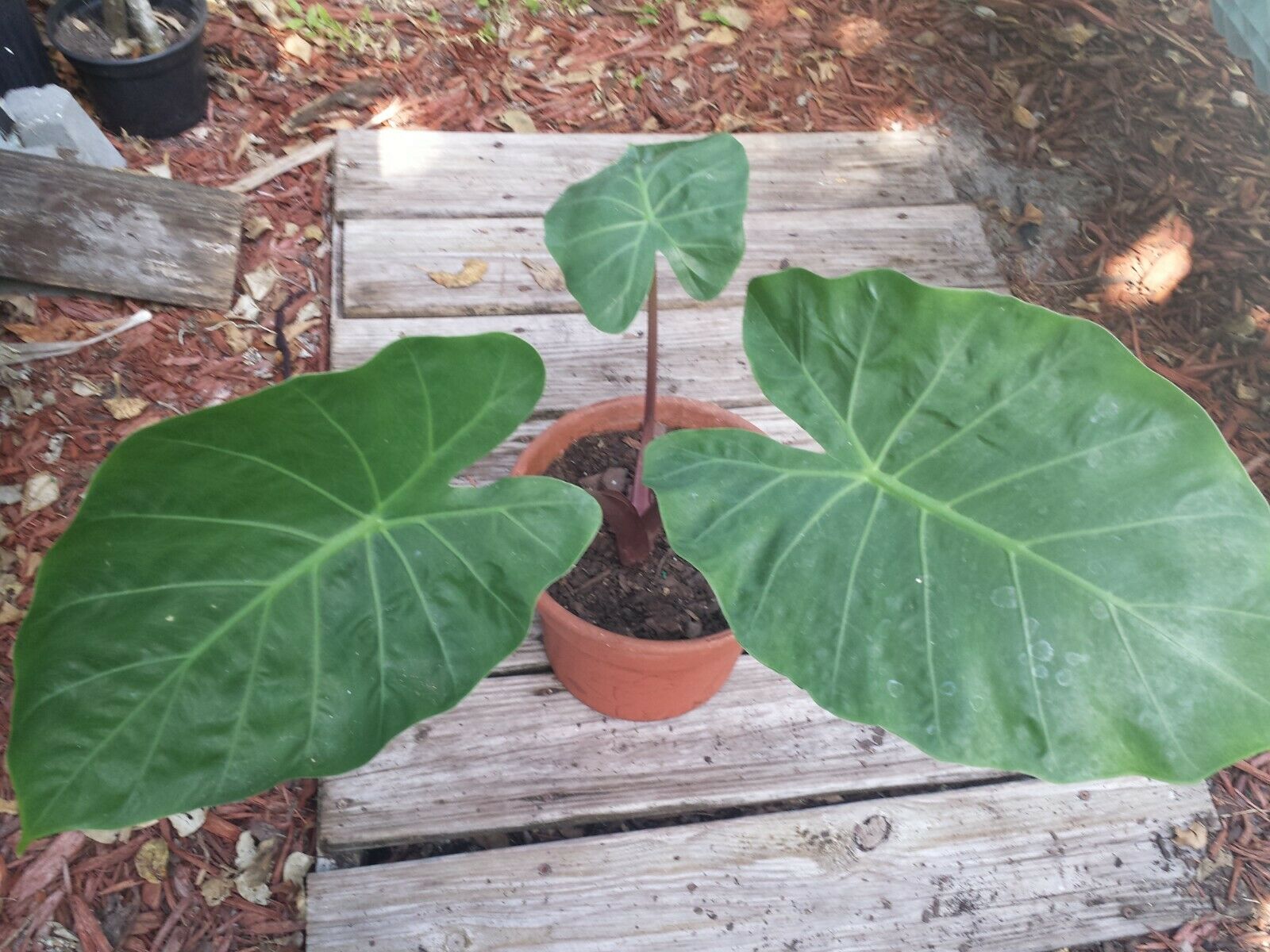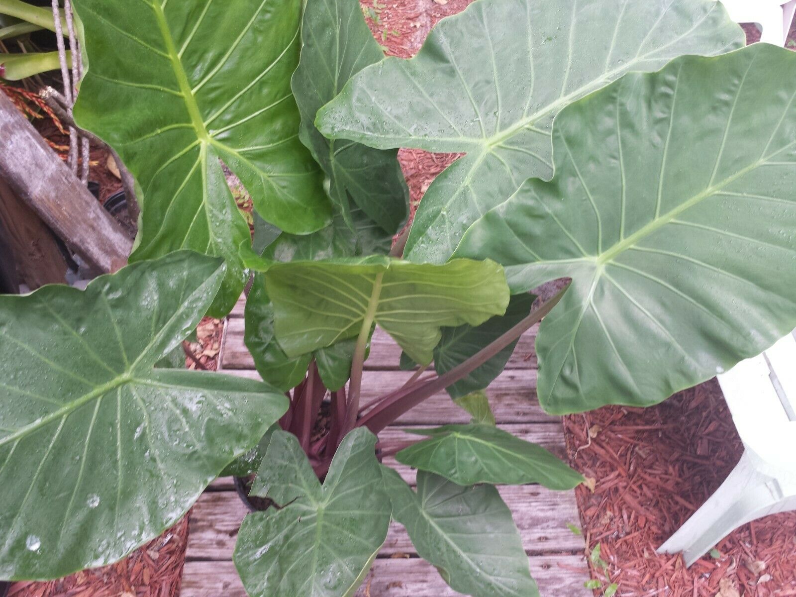 This is a Large Grower, can get to +6 feet tall. Massive arrow head leaves, rich solid green leaves supported on thick red stems. Different from Alocasia Hawaiian Punch or the Red Stem 'Ruhbarb' in that they grow much larger and red stem color ends below leaf, not red vein underside. Perfect for corner or center piece plant in flower bed. Does well in large pot indoors in rich fast draining medium watered twice a week.