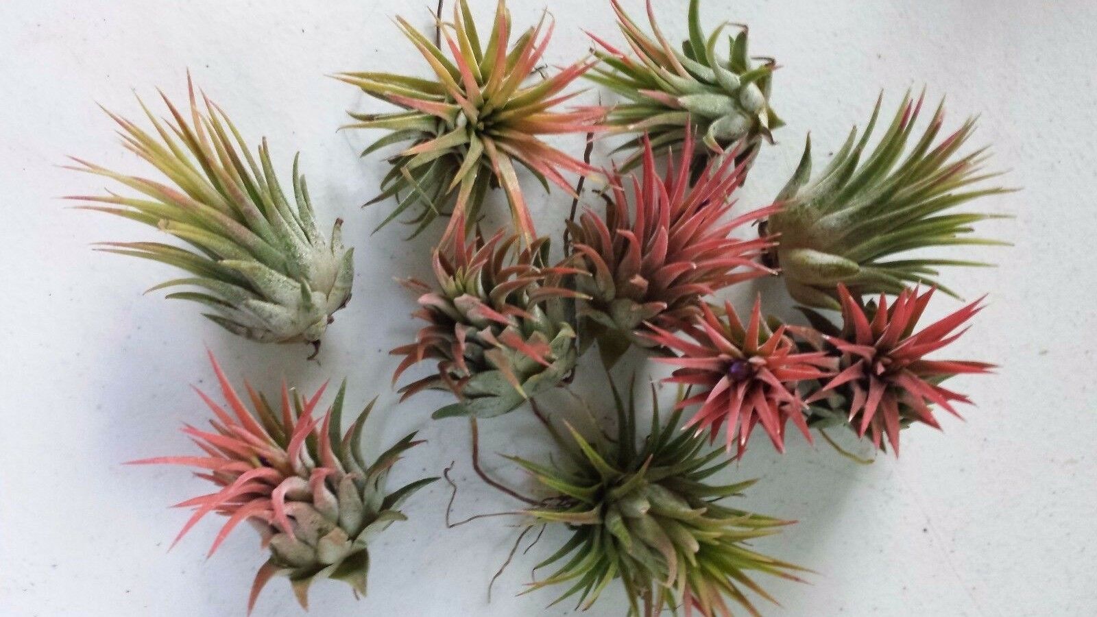 Bromeliad Tillandsia ionantha Rubra, listing is for a two plants similar to those shown in photos. One of my favorites! Plants are about 2 - 3 inches, currently may or may not be in blush / bloom. The rubra has nice long thick leaves compared to other ionanthas. Blush is more pinkish unlike the ionantha Fuego which is bright red. Plants can quickly get offsets/ pups that can be left attached to form colonies or divided once offset is about 1/3 size of parent plant. These Exotic Tropical Plants are an easy care plant that grows well most any where. In Spring most plants are in mature stage where they will blush and bloom. Afterwards in summer they will be developing offsets. ( See my listing for LARGE size 3- 4 inch plants. )