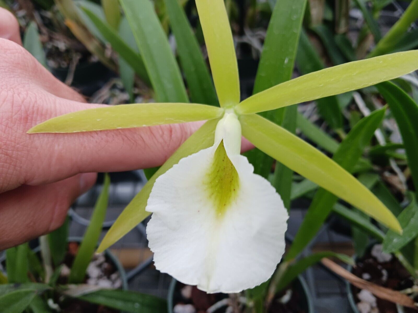 This member of the Cattleya Alliance, a Brassavola nodosa hybrid that has several blooms per spike. This great compact readily blooms. Quickly can become a very large colony. First photo is of bloom. Remaining photos are of plants similar to what you will receive, will have 5 or more psuedobulbs, spouts. It will be a mature blooming size plant that currently is near Spiking.