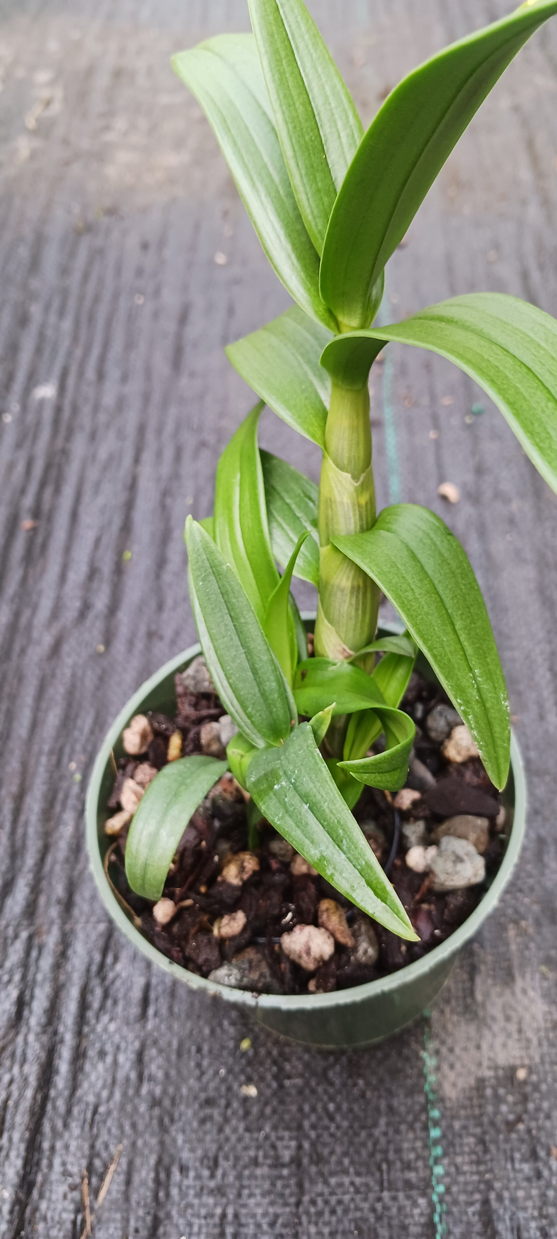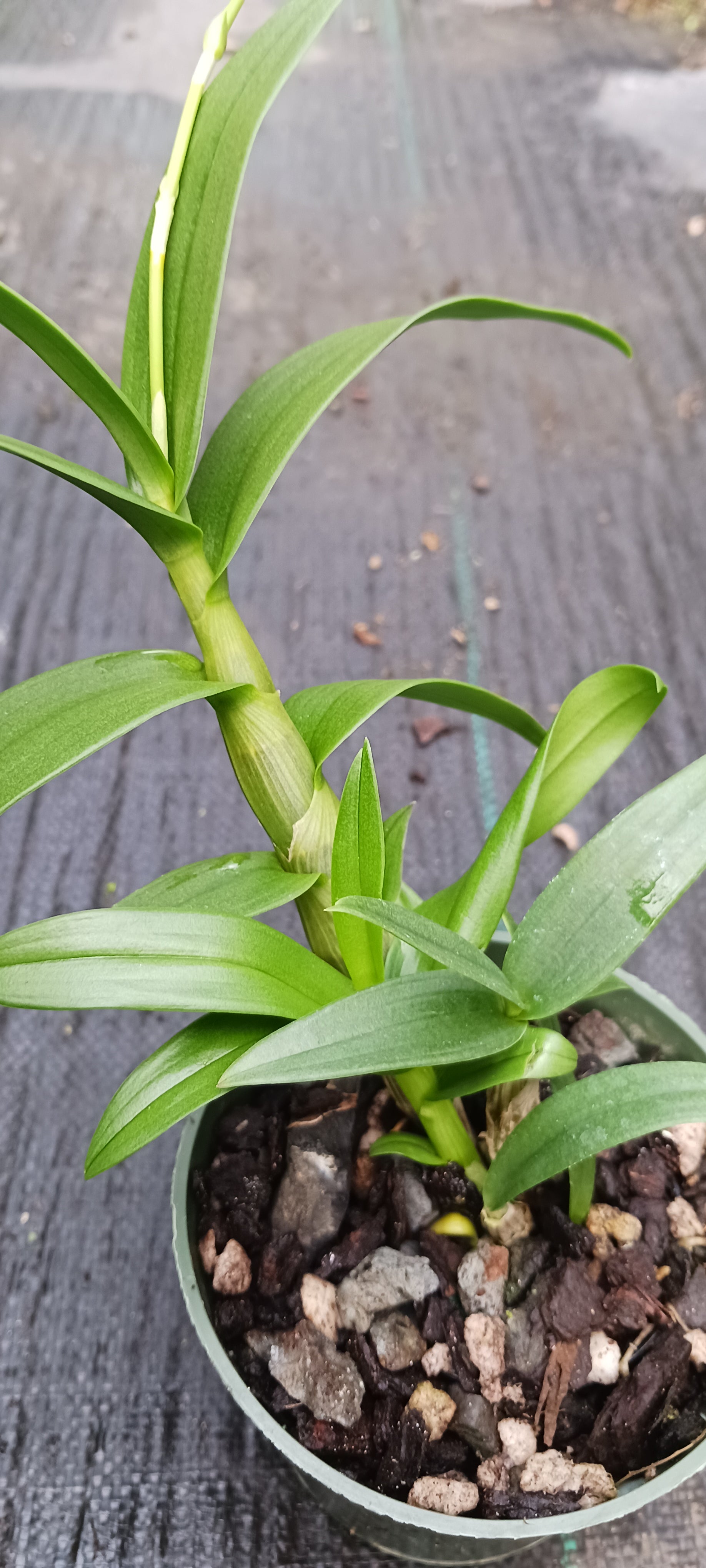 This is a short grower that likes to clump at base already showing a couple nice keiki. Plants look great in hanging basket or mounted with pendent hanging bloom spikes. The 1stpic shows large mature blooming plants in hanging basket, these are not planted listed for sale here. Second pic just of bloom. You will receive a similar plant as shown in 3rd, 4th photos that is mature blooming size and could be potted up, placed in hanging basket or mounted. Plants are BS, currently many are in in Spike/Bloom. The last two photos show how plants develop multiple keiki, young plants at base.