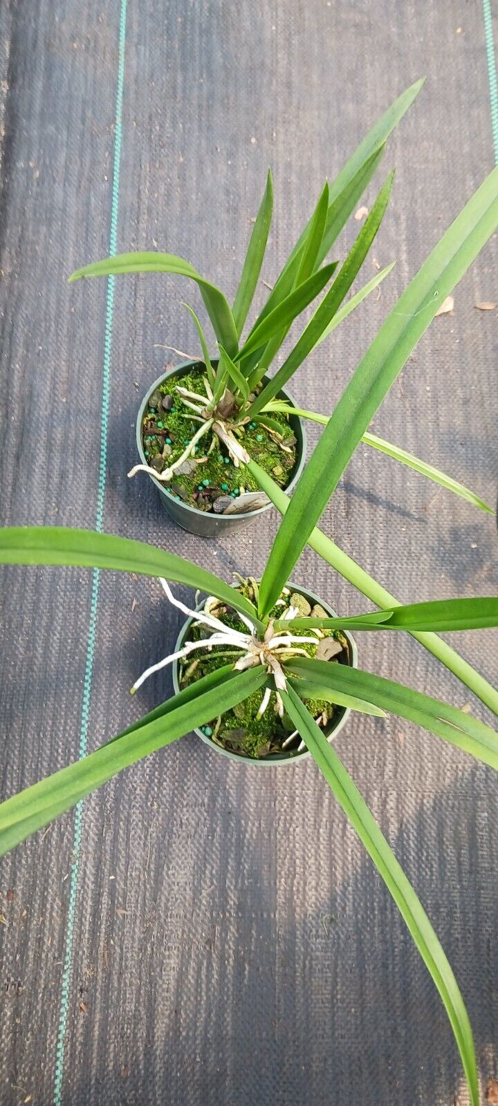 First parent: white large lip. Second parent: cross of one pink petals, is small yellowish lip, and the other blossom is rich purple. Do not recall if seen bloom of cross, found no photos. The pics are of plant similar to what you will receive, that is blooming size, may or may not be spiking.