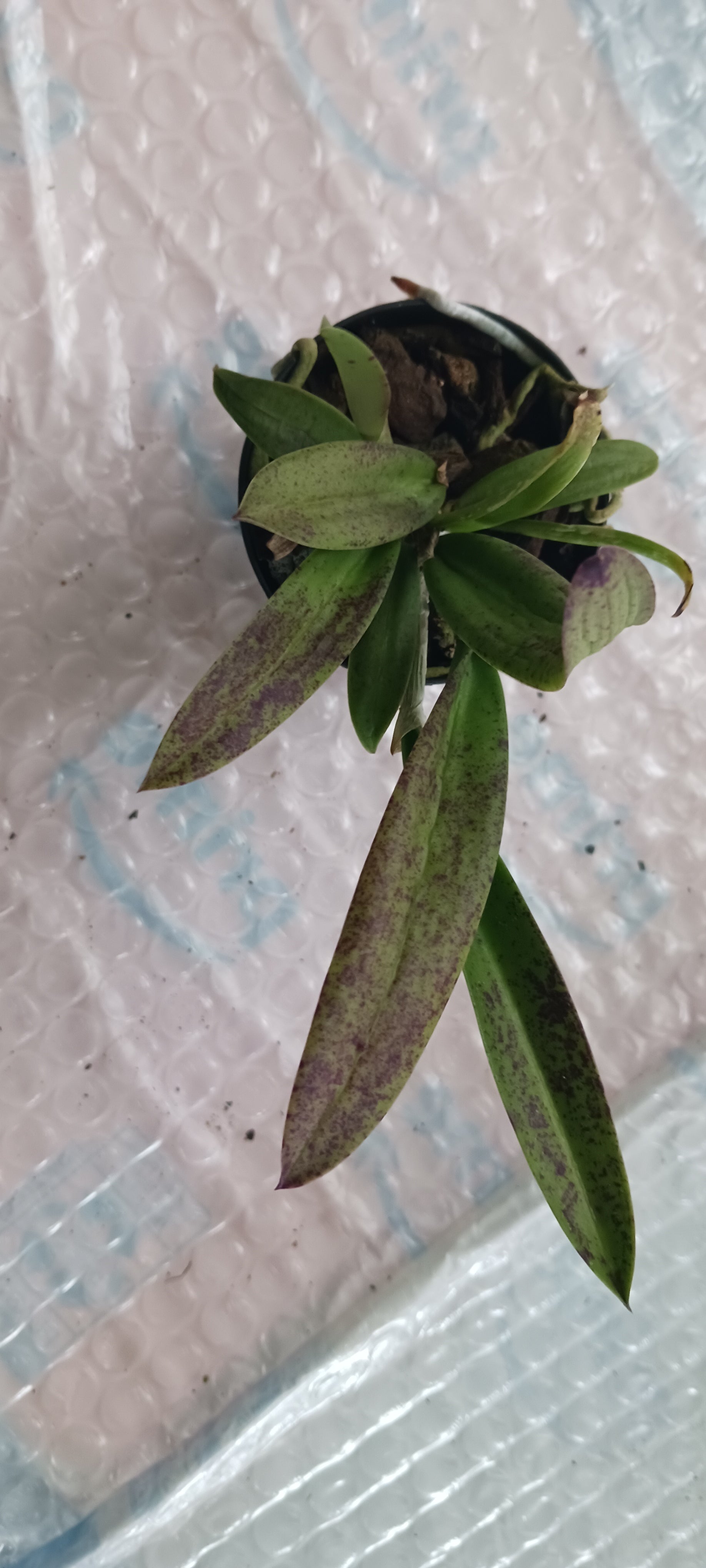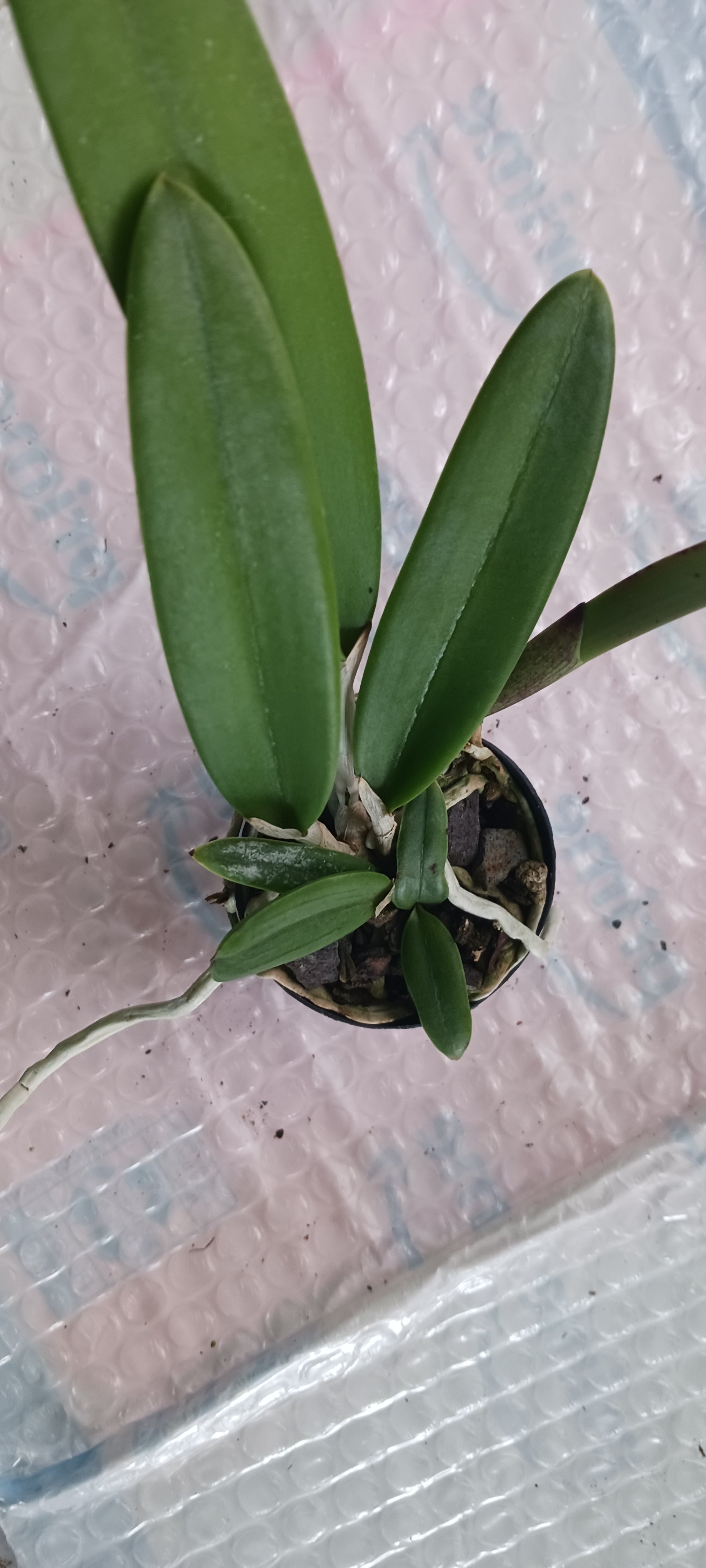 Plants currently near Spike/Bloom. Photos are of plants similar to what you will receive. Leaves may be totally green, or have some purple coloration or total purple color. Plants leaves like several brasavola color up purple hue when in very bright sunlight.
