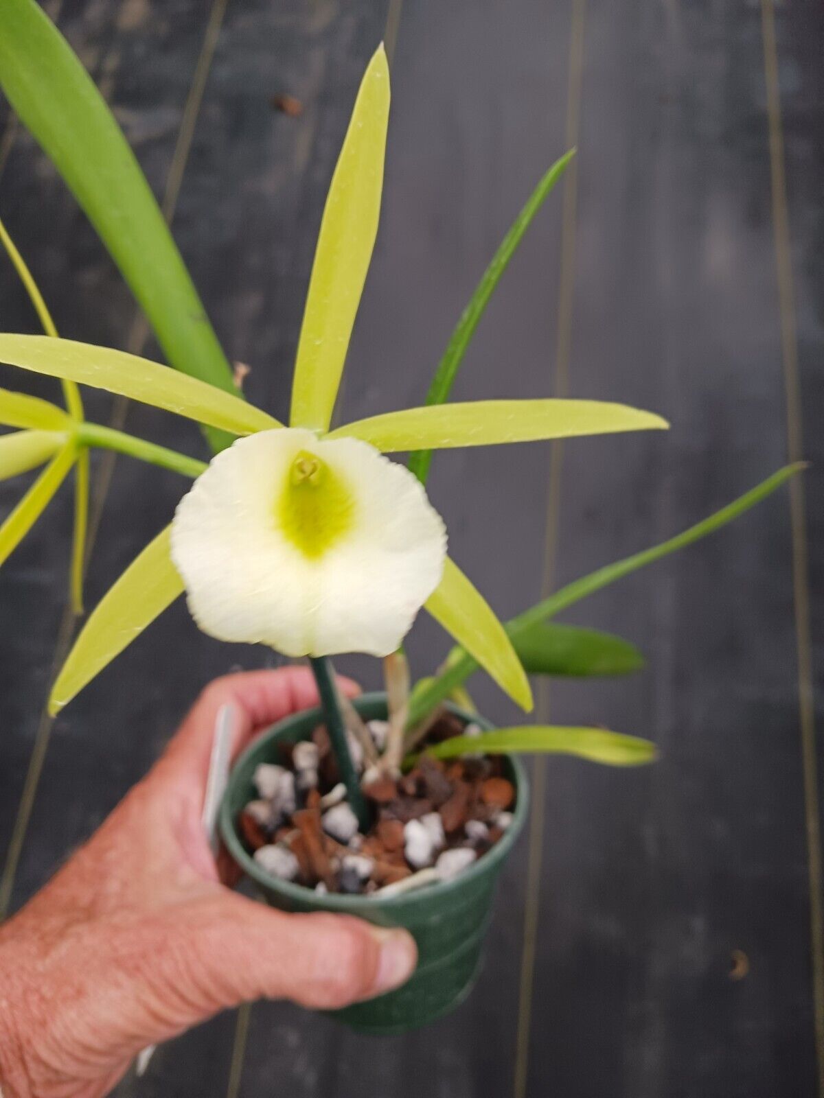 A great cross of Epc. Lime Sherbert x B. nodosa, nice star shaped blossom, Lime Green petals with large white lip.