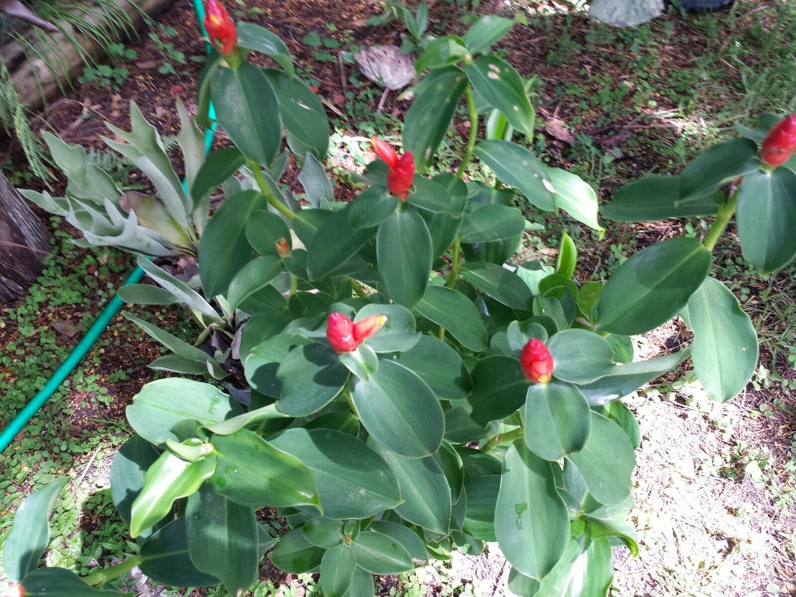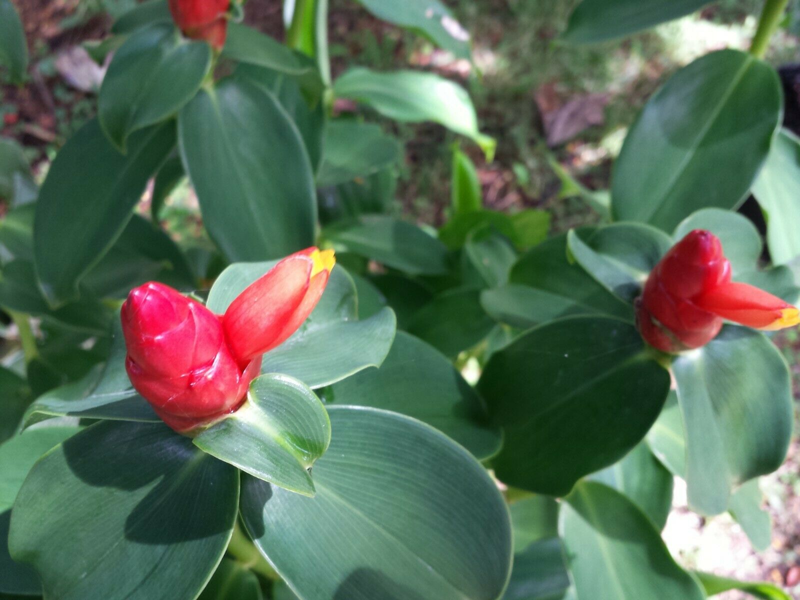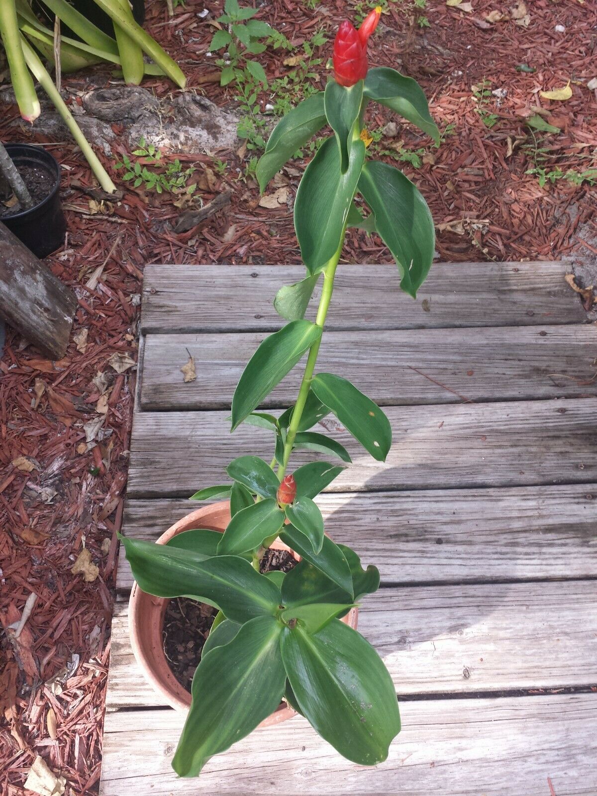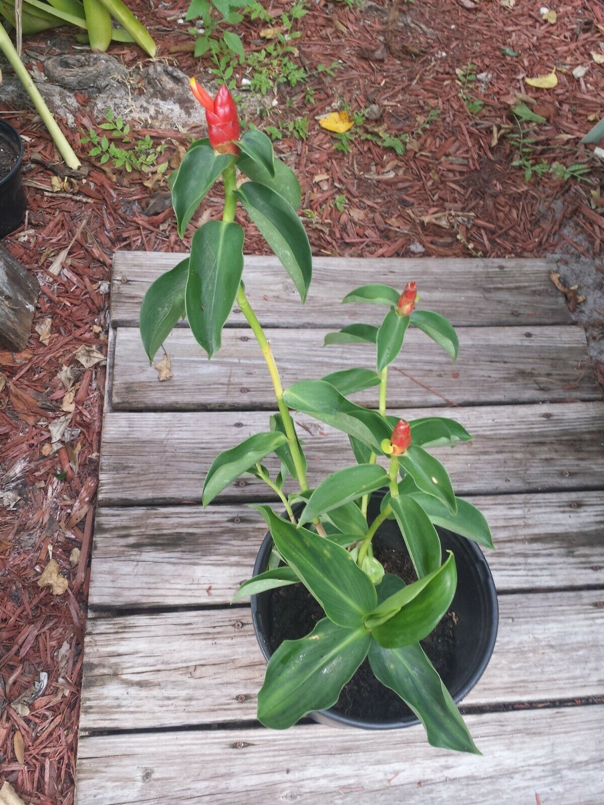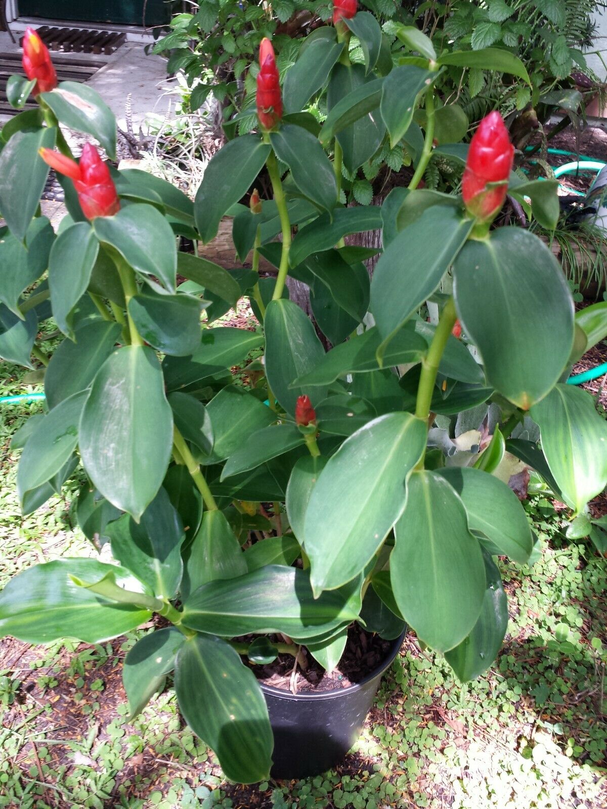 This Ginger gets pinecone shaped inflorescence at end of stem with bright red bracts. Flowers are of creamy - peach color are tube shaped and emerge generally one at a time. The spirally arranged red bracts form a pinecone shape from summer through fall here in Florida and last for weeks holding bright color. A tropical, subtropical plant grows in rich humus well-draining soil, from sunny to partial shaded conditions with lots of summer rains. Planted in Florida grows 4 to +6 feet will grow shorter in pot. Is cold hardy in zones 9 - 11 however should be covered well in 8 - 9 during winter months or potted and brought in doors as can freeze. Indoors place in large pot, bright filtered light, window south or west side. When lightly squeeze a clear fragrant jell oozes from cone that can be used as shampoo, thus aka shampoo ginger. There are many let's say varieties with cone being pinker to salmon or golden. This one is bright red.