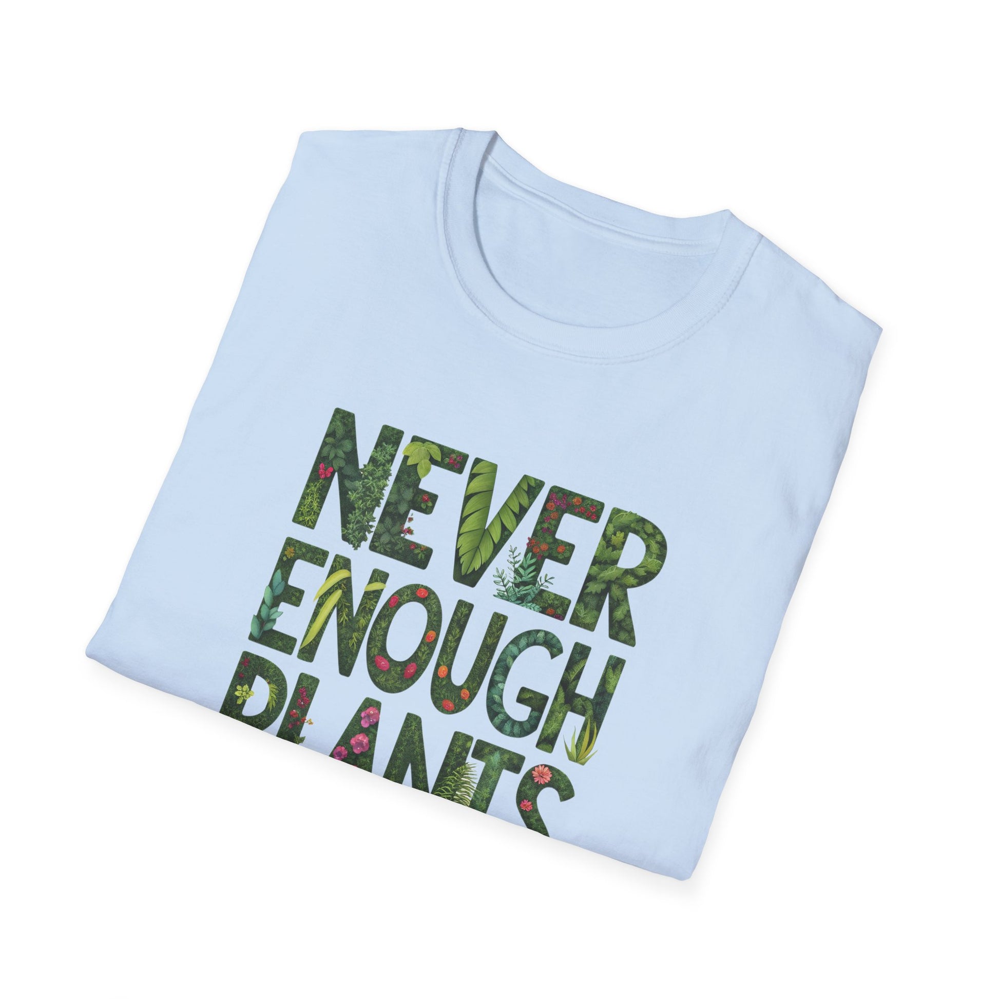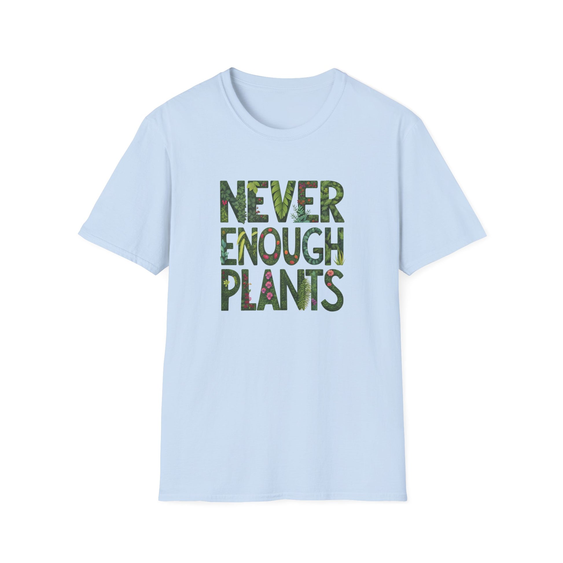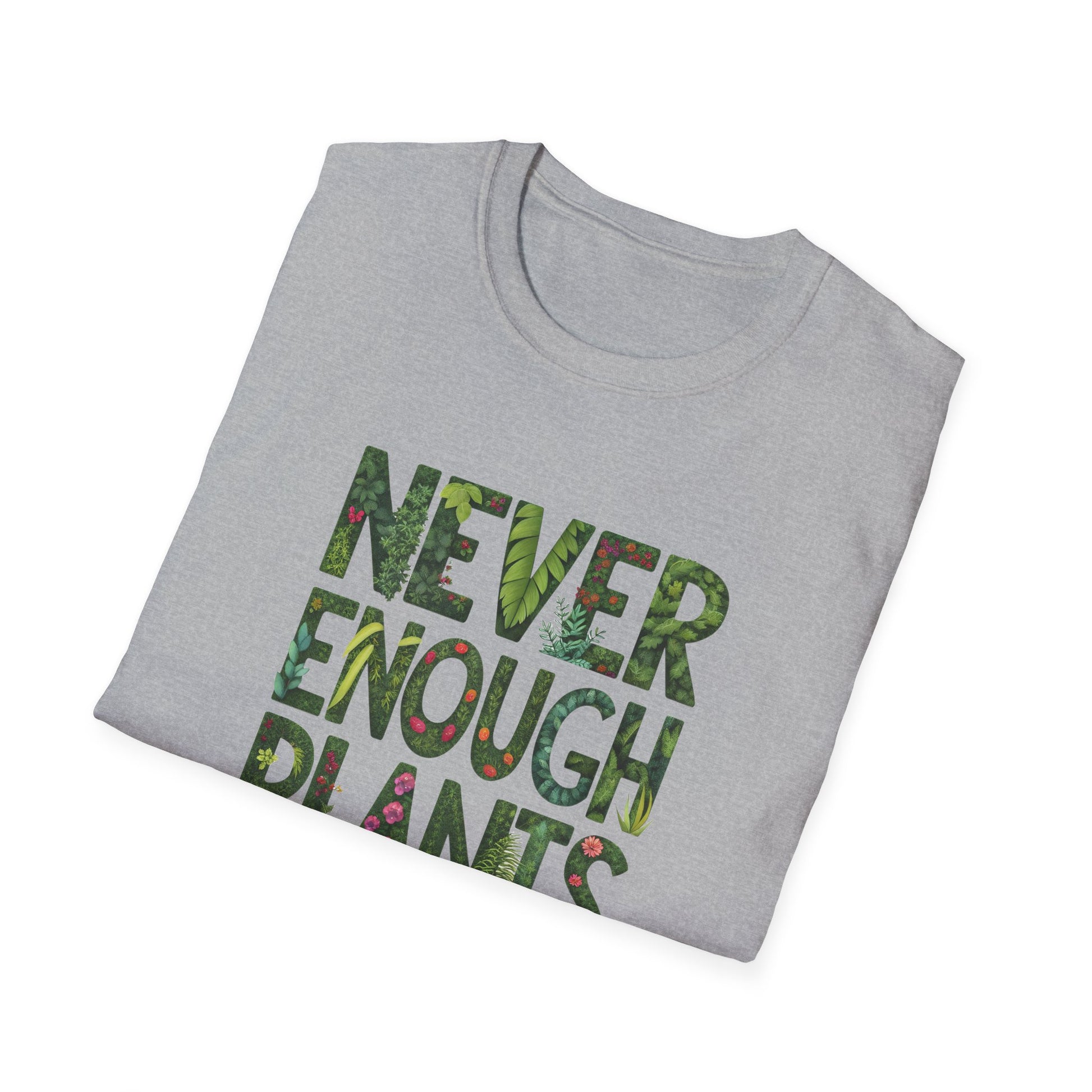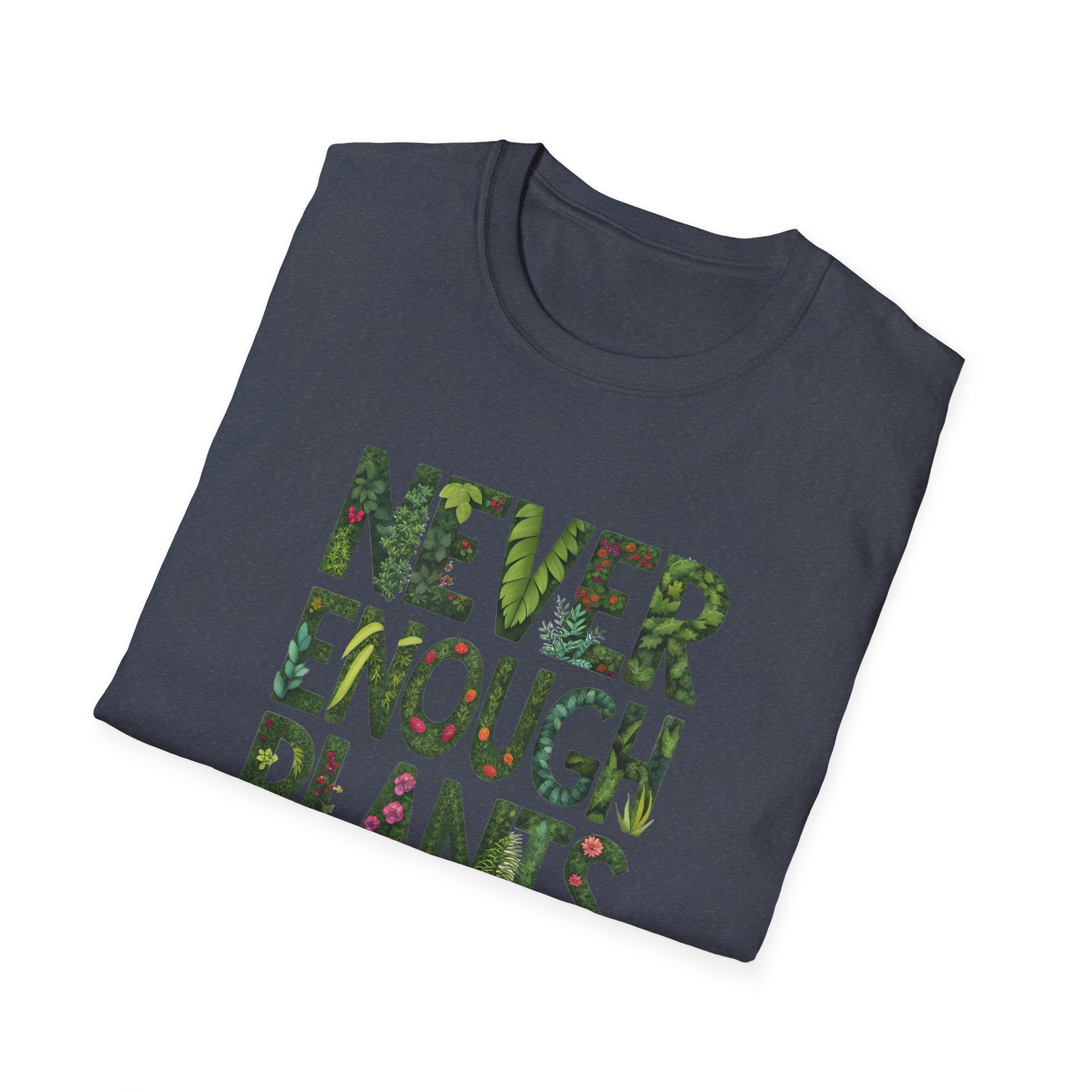 Embrace your love for greenery with this charming unisex t-shirt. Featuring the phrase 'Never Enough Plants', it perfectly captures the essence of plant enthusiasts and nature lovers. This lightweight t-shirt offers a soft and breathable feel, making it perfect for year-round wear. Its classic fit and versatile design enable you to effortlessly style it for casual outings, gardening sessions, or eco-conscious gatherings. Ideal for gifting on occasions like Earth Day, birthdays, or just a fun treat for yourself, it's a must-have for anyone passionate about nurturing the environment and celebrating nature's beauty.
