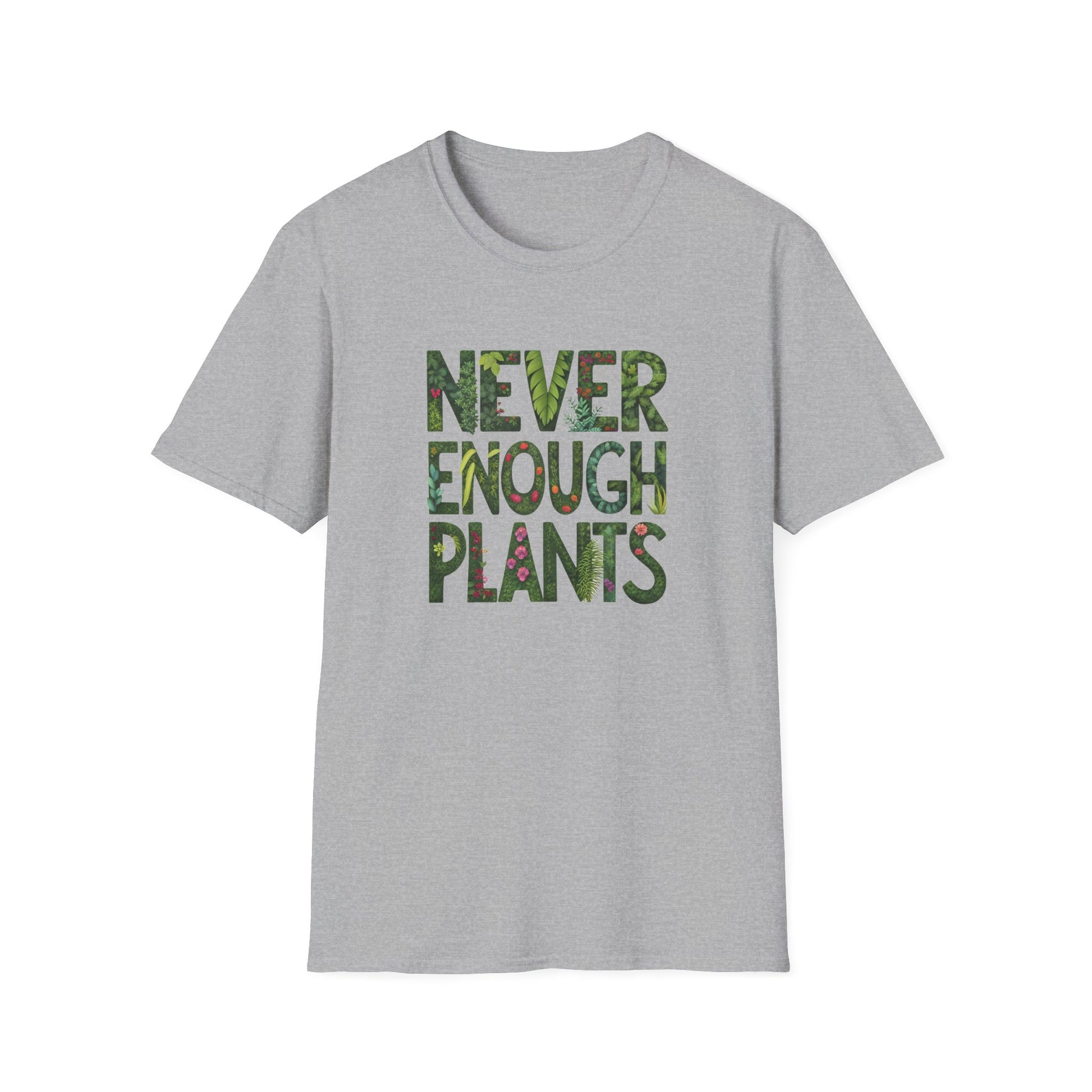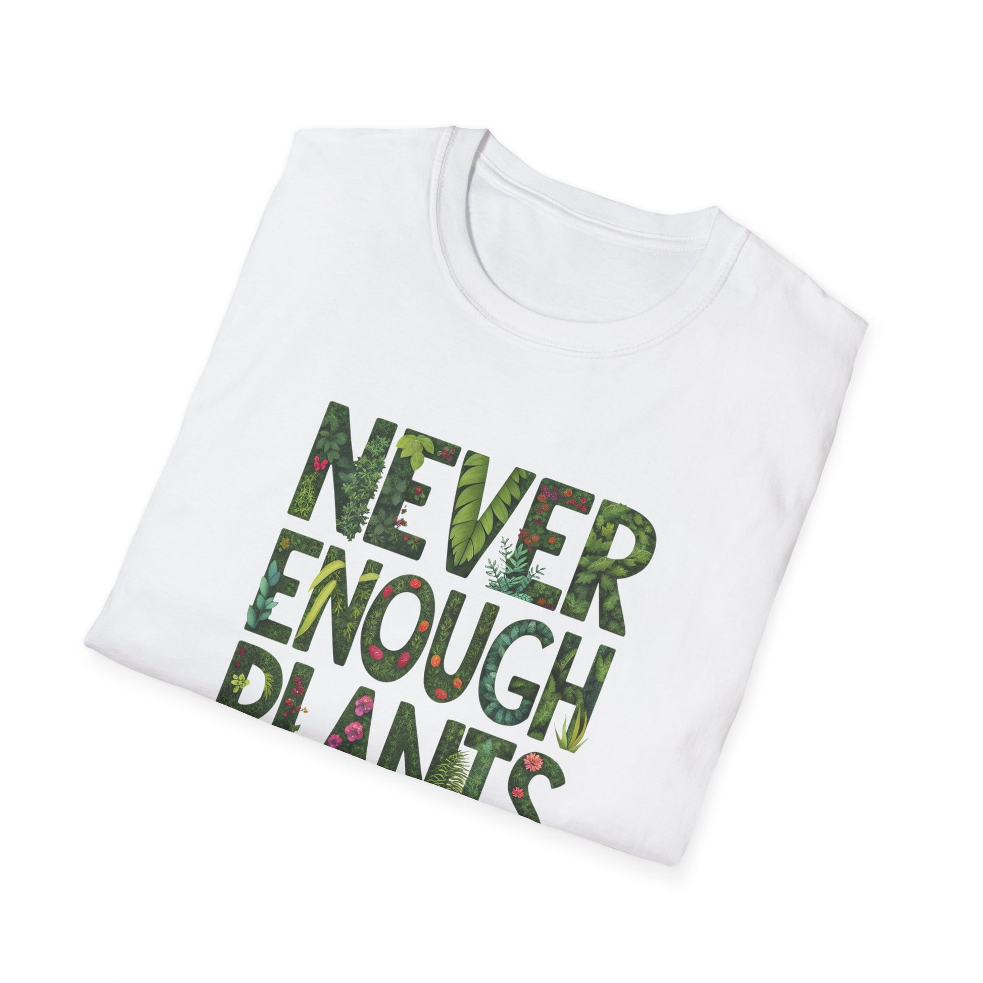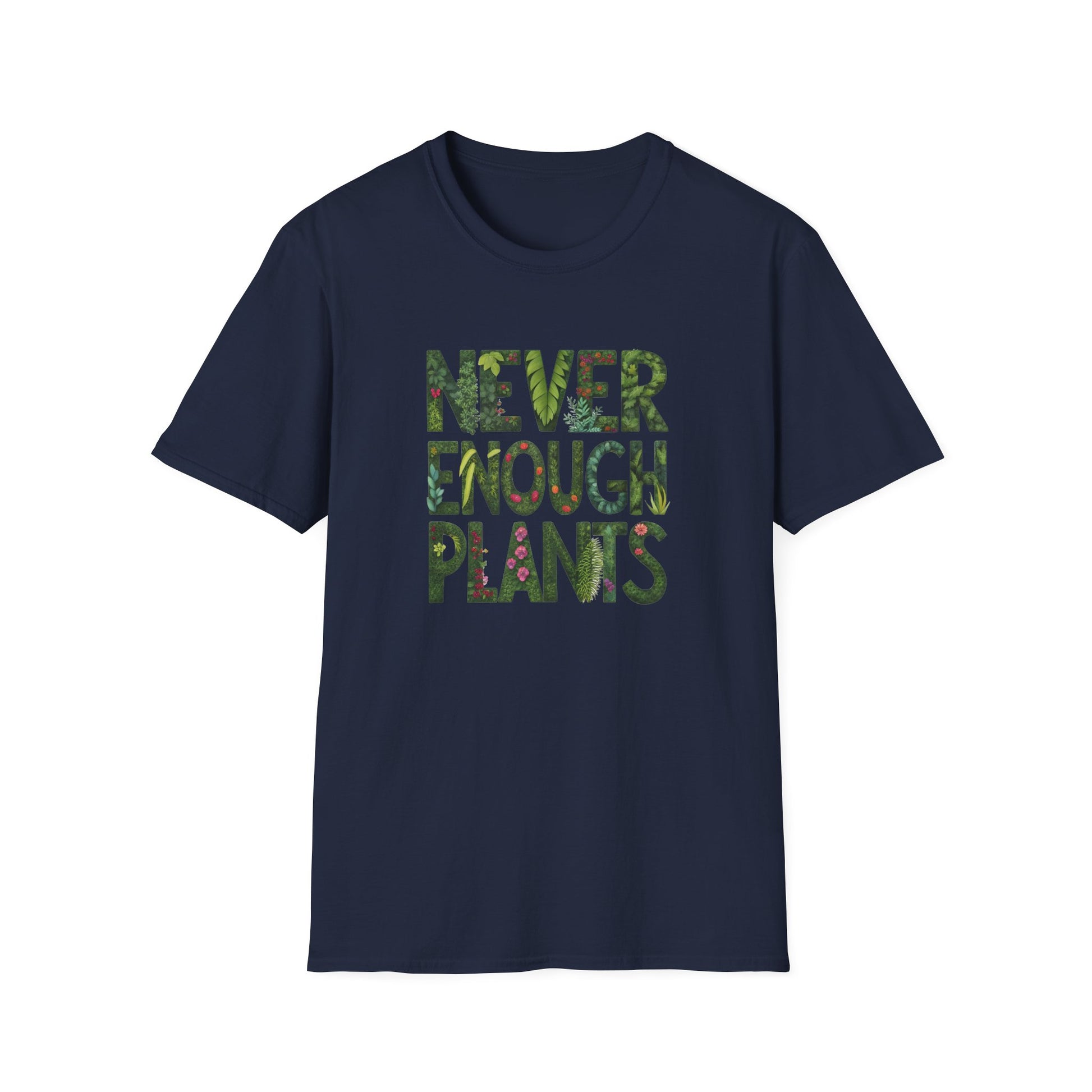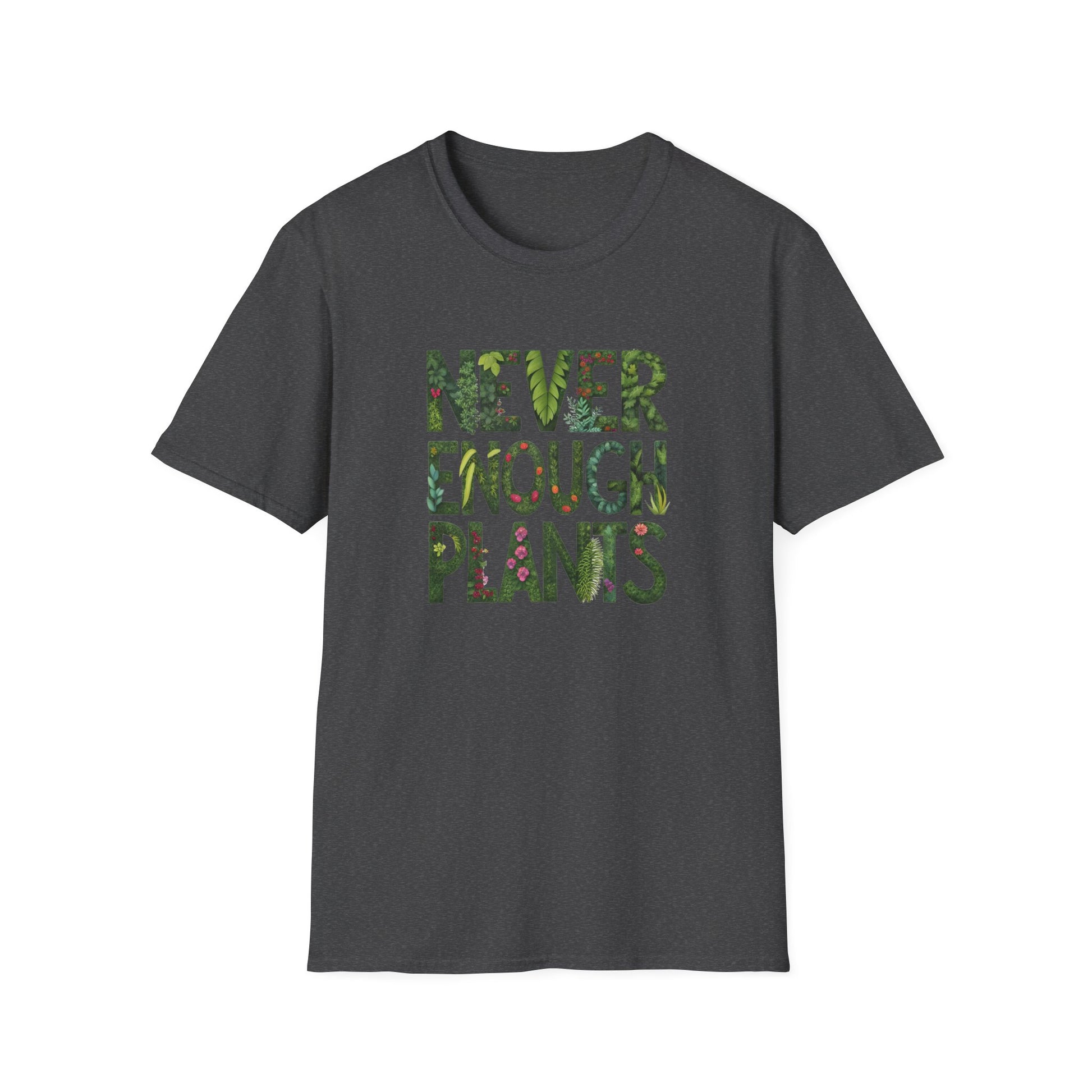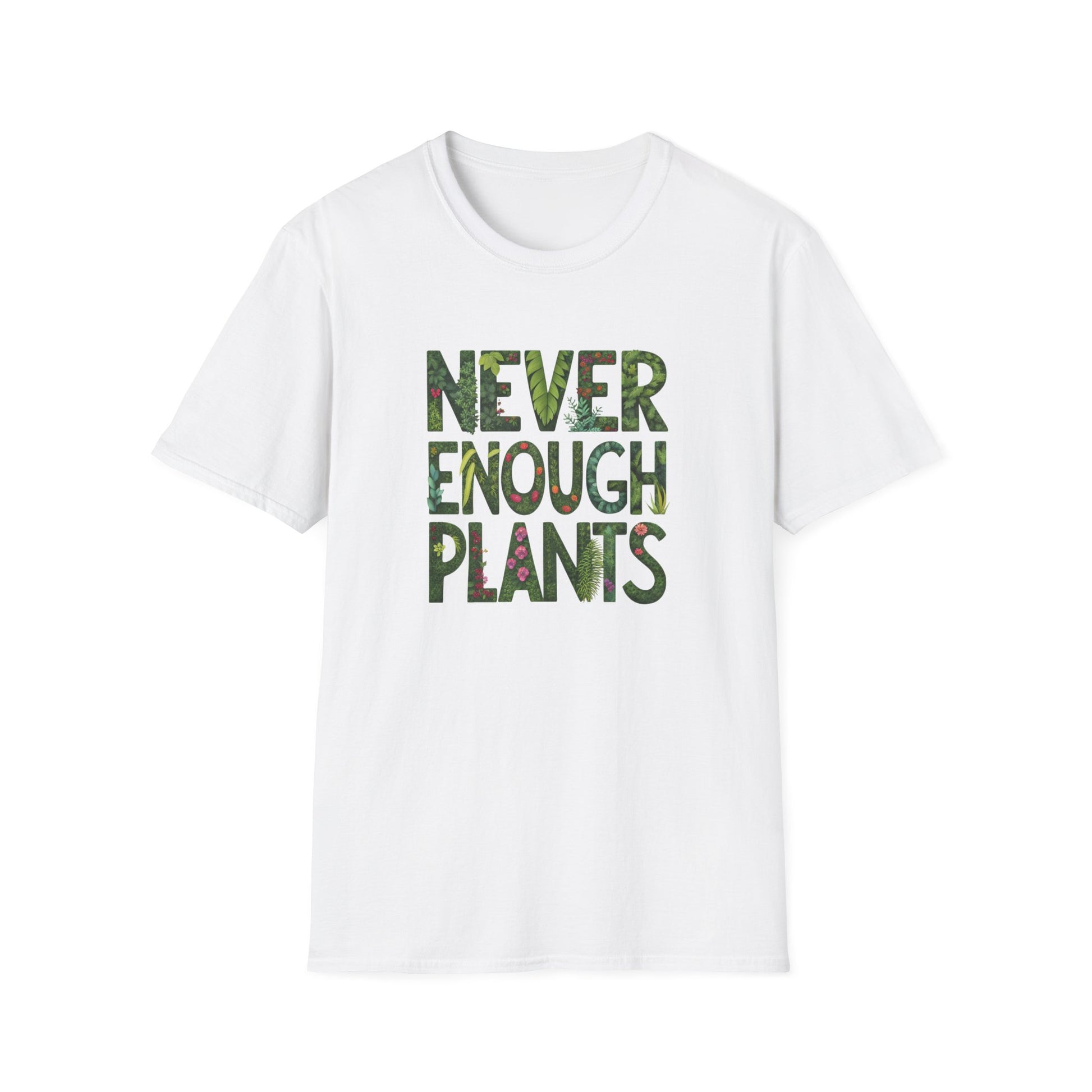 Embrace your love for greenery with this charming unisex t-shirt. Featuring the phrase 'Never Enough Plants', it perfectly captures the essence of plant enthusiasts and nature lovers. This lightweight t-shirt offers a soft and breathable feel, making it perfect for year-round wear. Its classic fit and versatile design enable you to effortlessly style it for casual outings, gardening sessions, or eco-conscious gatherings. Ideal for gifting on occasions like Earth Day, birthdays, or just a fun treat for yourself, it's a must-have for anyone passionate about nurturing the environment and celebrating nature's beauty.
