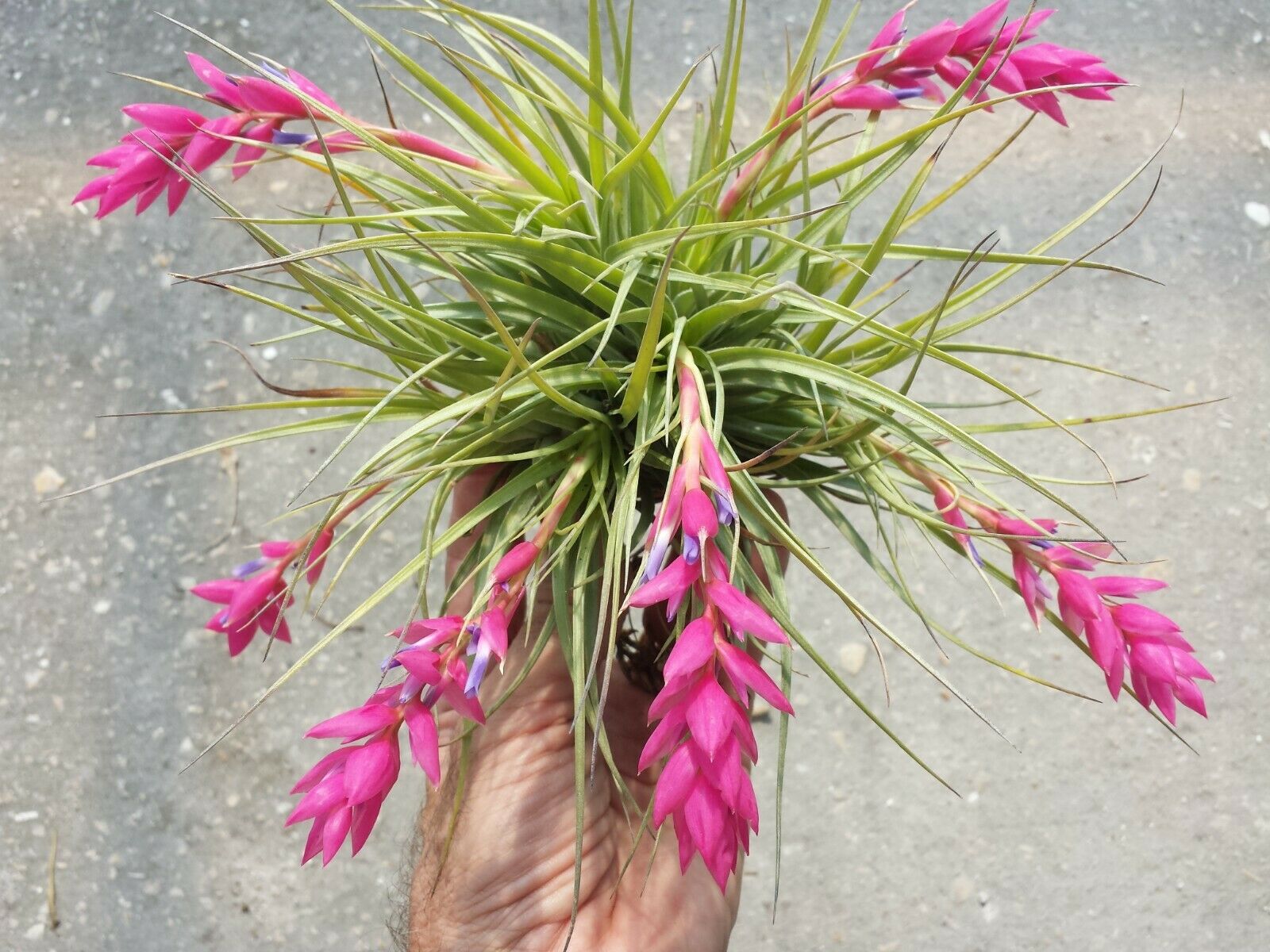 Tillandsia stricta can be grown lose, mounted, in a seashell, hanging wire, driftwood, almost anywhere but not in soil. Unlike many tillandsia that are grown for their unusual look rather than flower, this tillandsia it is the flower. The plant produces a bloom spike with HOT HOT Pink bracts and little blue flowers. This listing is for a cluster of plants similar to those in photos, that currently may or may not be in spike/ bloom, some are showing near or in beginning June to August will finish major bloom. I will always send in spike when I have plants that are starting to spike but sometimes sell out before next group begins to bloom. May bloom at any time.