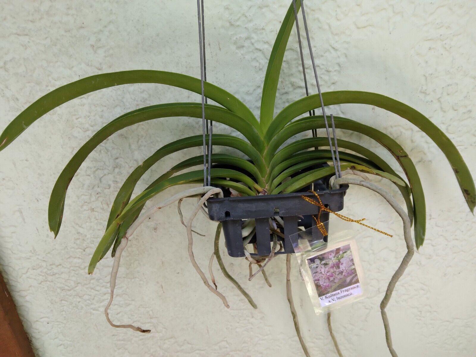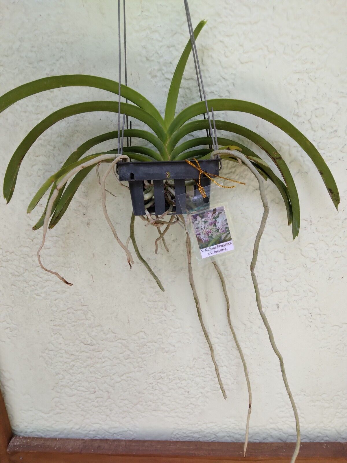 Since Vanda are grown bare root there is no medium to hold water, so hard to over water. Plant should be watered well. Water entire plant by placing in shower, submerged in bucket, sink or tub. Vanda can be watered 3 – 4 times a week for 10 minutes, even every day during summer less during winter months.